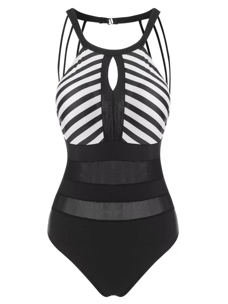 Striped Mesh Panel Keyhole Sheer One-piece Swimsuit
